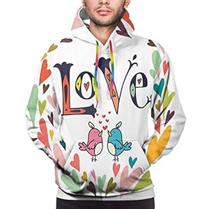 Men’s Hoodies Sweatshirts,Cartoon Circular Wreath of Colorful Hearts with Lover Birds and Love Word Typography