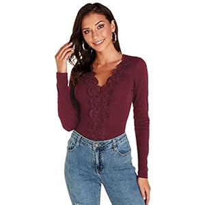 Features: spitzenoberteil damen, langarmshirt damen sexy, eng oberteil damen, elegant bluse, v-ausschnitt schicke oberteile damen mit spitze design, hervorhebung ihrer sexy figur, elegant und stilvoll, man im Herbst und Winter nicht verpassen kann.