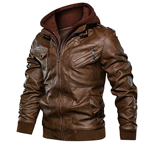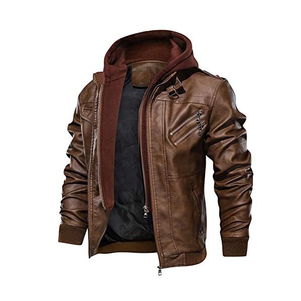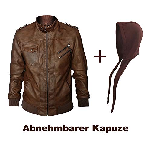 Dies ist eine Bikerjacke mit Stehkragen. Es ist ein 2in1 Design mit abnehmbarer Kapuze. Dies Vintage Mode Bomberjacke ist homosexuell und Windproof. Es ist enorm O. K. angebracht bei kaltem Wetter im Herbst und Winter.