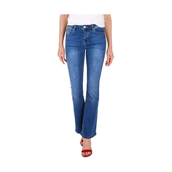 Bei dieser schönen alltäglich hoch geschnittenen Damenjeans handelt es sich um ein Jeansmodell im Bootcut Stil via einer hochwertigen used u. a. flare Waschung. Die klassische Hüftjeans in Classic Denim Blue im five Pocket Stil hat einen Reissverschluss u. a. ein ausgestelltes Bein. Die Damenhose besteht ganz 68,6% Baumwolle, 29,3% Polyester u. a. 2,1% Elasthan. Vor dem Hintergrund den Elasthananteil hat diese Damenjeans eine gute Passform, sowie einen hohen Tragekomfort. Dieses Jeansmodell ist in folgenden Größen erhältlich: 34/XS, 36/S, 38/M, 40/L, 42/XL.