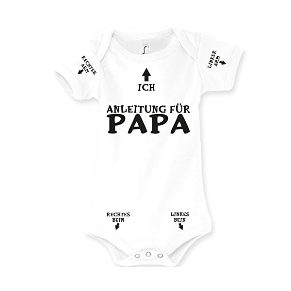 Die perfekte Eltern Geschenk Idee zur Geburt eines Babys ist unser Babystrampler Anleitung für Papa. Die Baby Bekleidung ist ein echter Klassiker mit Witz! Auf dem Baby Strampler sind jeweils die wichtigsten Merkmale aufgedruckt die der Vater definitiv nicht vergessen sollte. Kommt bei Eltern, Freunden, Bekannten und Großeltern lustig an!